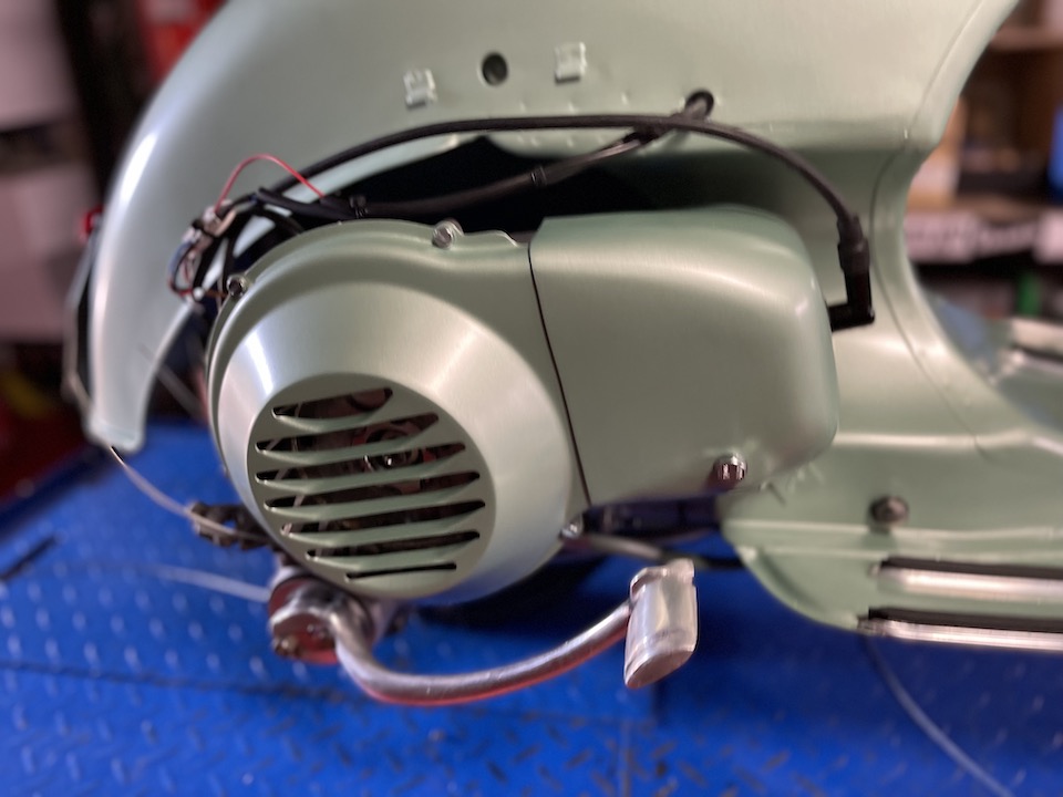 La famille a décidé de la faire complètement restaurer et me l’on confiée. Elle a été entièrement démontée et confiée à mon carrossier/peintre qu’il l’a remise en état et repeinte dans sa teinte d’origine. Le moteur a aussi été entièrement rénové : remplacement de tous les joints spis, roulements, vilebrequin, segments neufs, croisillon de boite de vitesses, réfection du pignon élastique, passage du carburateur aux ultra-sons, échappement neuf et pose d’un allumage électronique SIP Vape 12 volts.
